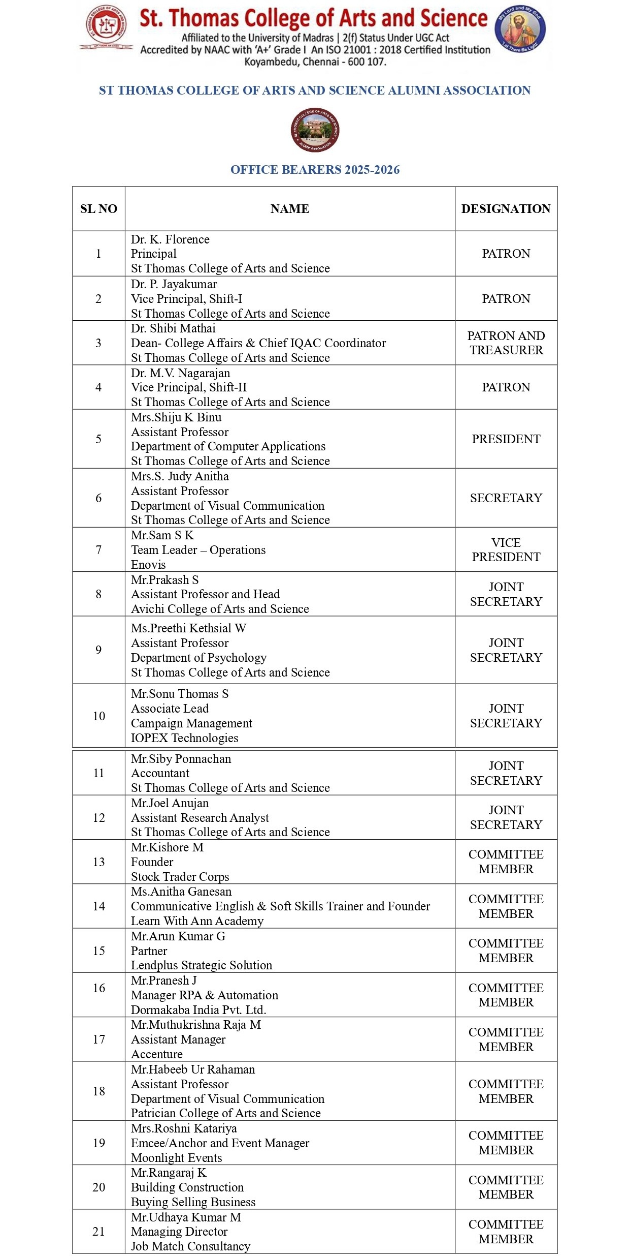ST THOMAS COLLEGE OF ARTS AND SCIENCE ALUMNI ASSOCIATION (STCASAA)